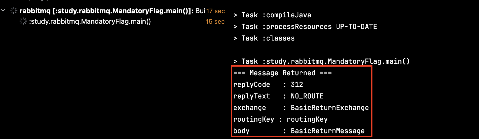 mandatory 플래그를 설정하고 메시지 라우팅이 실패했을 때 오류가 발생하는 게 아니라서 위와 같이 할 경우에는 애플리케이션은 아무런 행동을 수행하지 않습니다.