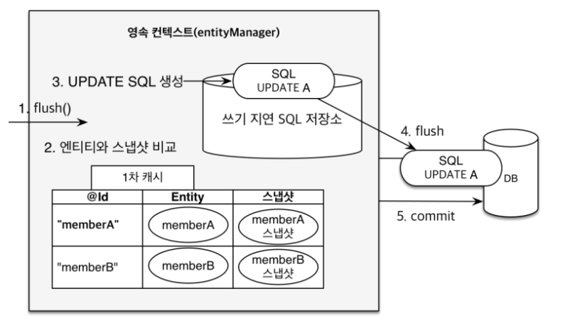 - 영속성 컨텍스트에 저장을 한다고 데이터 베이스에 저장이 되는 것이 아닙니다. 트랜잭션이 커밋하는 순간에 데이터베이스에 반영을 하는데 이것을 flush라고 합니다.