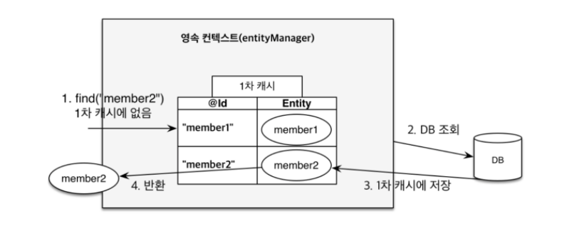 - em.find(엔티티 타입, 엔티티 식별 값) : em.find는 1차 캐시에 엔티티 값이 있으면 데이터베이스를 조회하지 않고 메모리에 있는 1차 캐시에서 엔티티를 조회하고 없으면 데이터베이스에서 조회하여 1차 캐시에 조회한 엔티티를 저장을 한 후 영속 상태의 엔티티를 반환합니다.