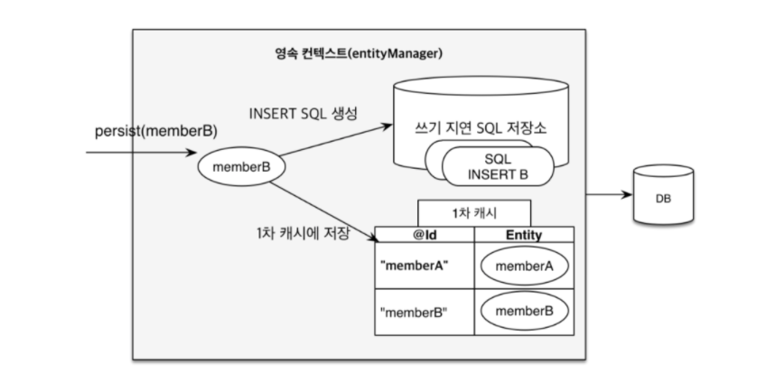 1차 캐시에 있는 엔티티 값들은 바로 쿼리문을 실행하지 않습니다. 커밋이나 플러시를 하기 전까지 쓰기 지연 SQL 저장소에 쿼리문을 보관을 해놓고 있기 때문입니다. 이 기능을 활용하면 성능을 최적화할 수 있습니다.
