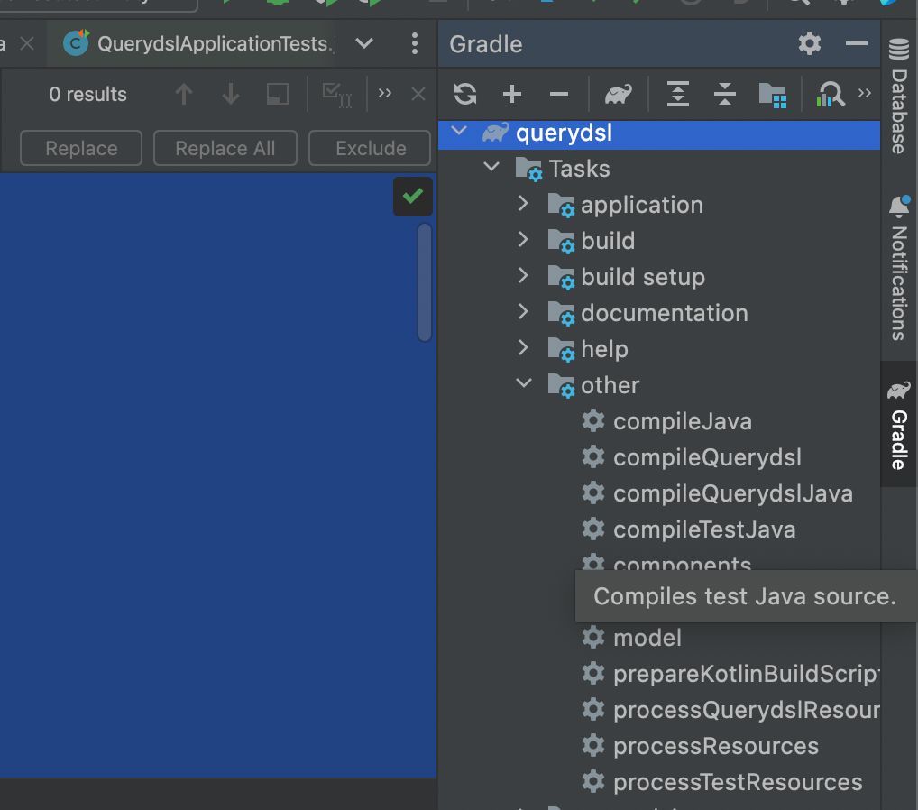 추가를 한뒤 Gradle에서 Tasks를 클릭 후 compileQuerydsl을 더블클릭하여 실행해 줍니다.