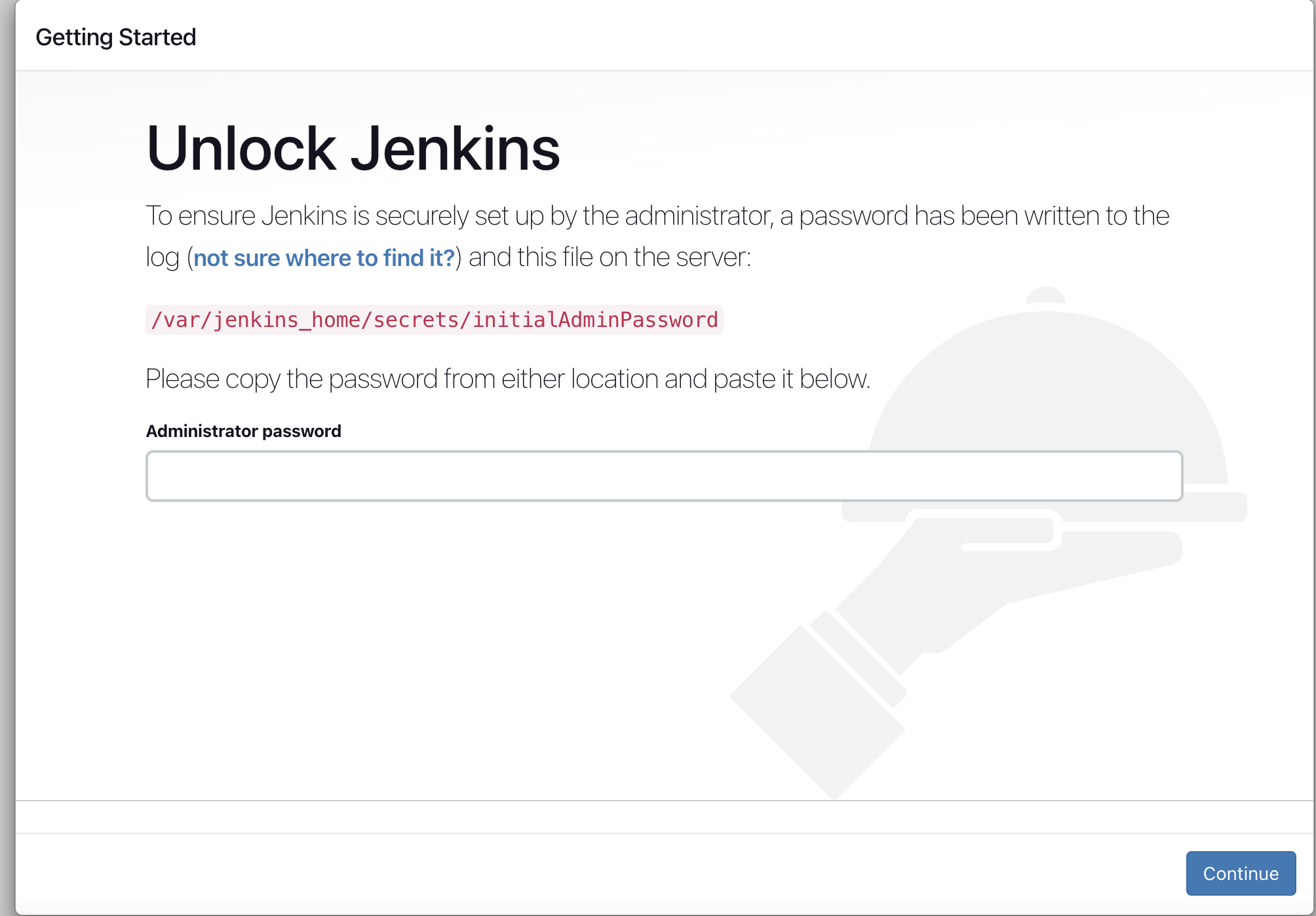4. 브라우저에 http://ip주소:8000 (8000은 필자가 설정한 포트번호)를 하면 아래와 같은 사진에 초기에 발급받은 비밀번호를 입력하는 화면이 나옵니다. 비밀번호 입력하는 곳에 초기에 발급받은 비밀번호를 입력하고 Continue를 클릭합니다.