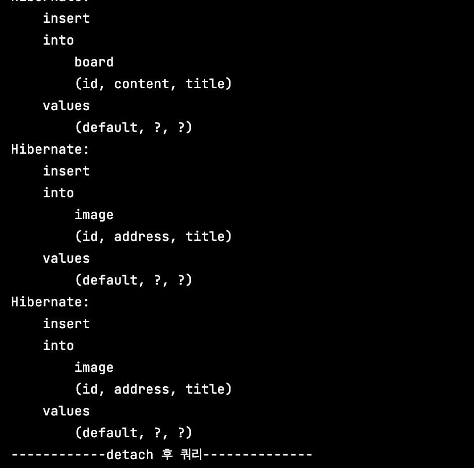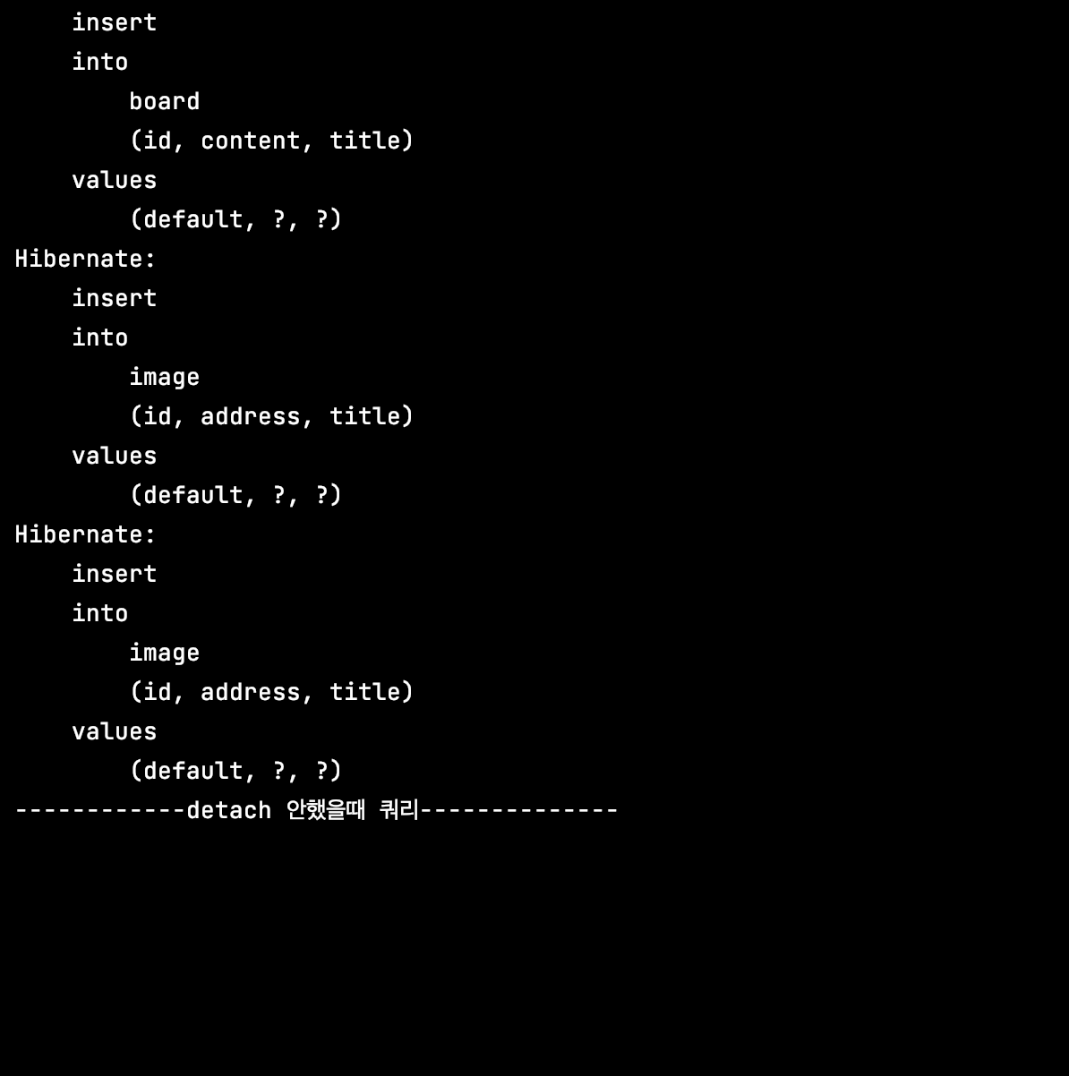 DETACH를 안 했을 때 em.persist로 Board와 Image 엔티티는 1차 캐시에 영속 상태로 있어 Board와 Image 엔티티를 찾아올 때 DB를 통해 가져오는 게 아닌 1차 캐시에서 가져오기 때문에 SELECT 쿼리가 발생하지 않는 것을 확인할 수 있습니다.