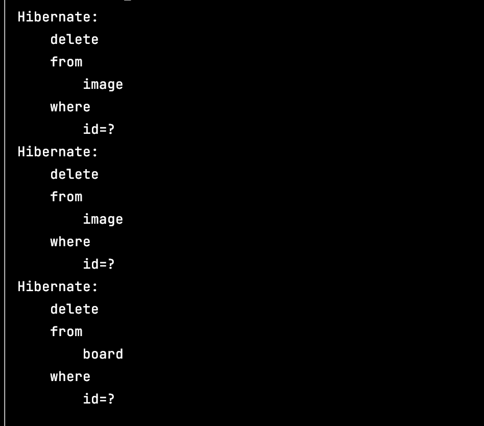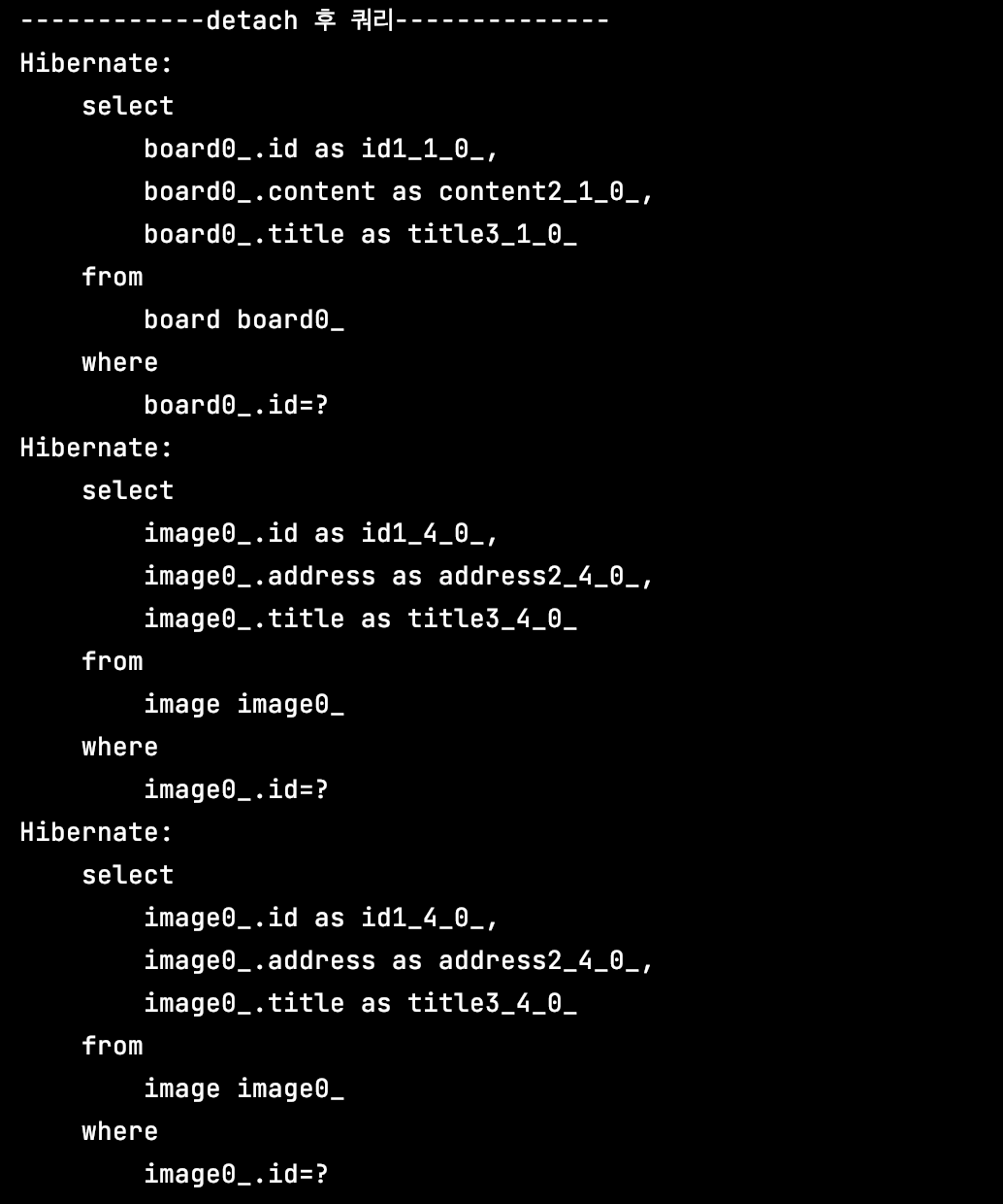 em.persist를 하여 1차 캐시에 Board와 Image에 대한 정보가 담겨 있는데 영속성 컨텍스트를 em.detach를 하여 엔티티 생명주기를 준영속 상태가 되었습니다. 그래서 Board와 Image 엔티티를 찾아올 때 SELECT 쿼리가 발생하는 것을 확인할 수 있습니다.