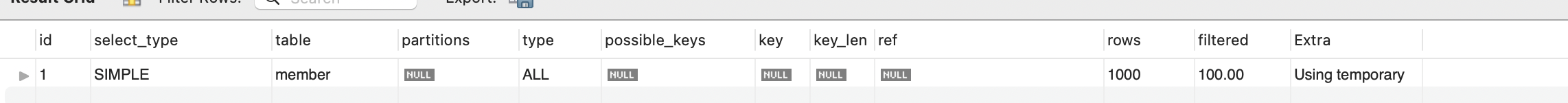 - rows : 접근 방식을 사용해서 몇 행을 가져왔는지 표시하는 필드입니다. 최초에 접근하는 테이블에 대해서 쿼리 전체에 의해 접근하는 행 수 그 이후에 테이블에 대해서는 1행 조인으로 평균 몇 행에 접근했는가를 표시합니다.