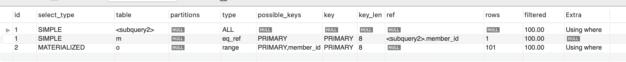 EXPLAIN SELECT m.*, o.* FROM MEMBER m INNER JOIN ORDERS o ON m.id = o.member_id;