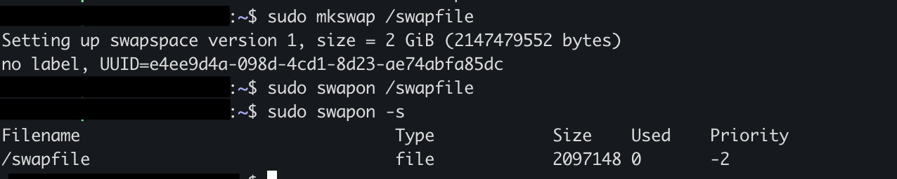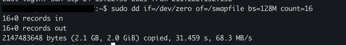 sudo dd if=/dev/zero of=/swapfile bs=128M count=16