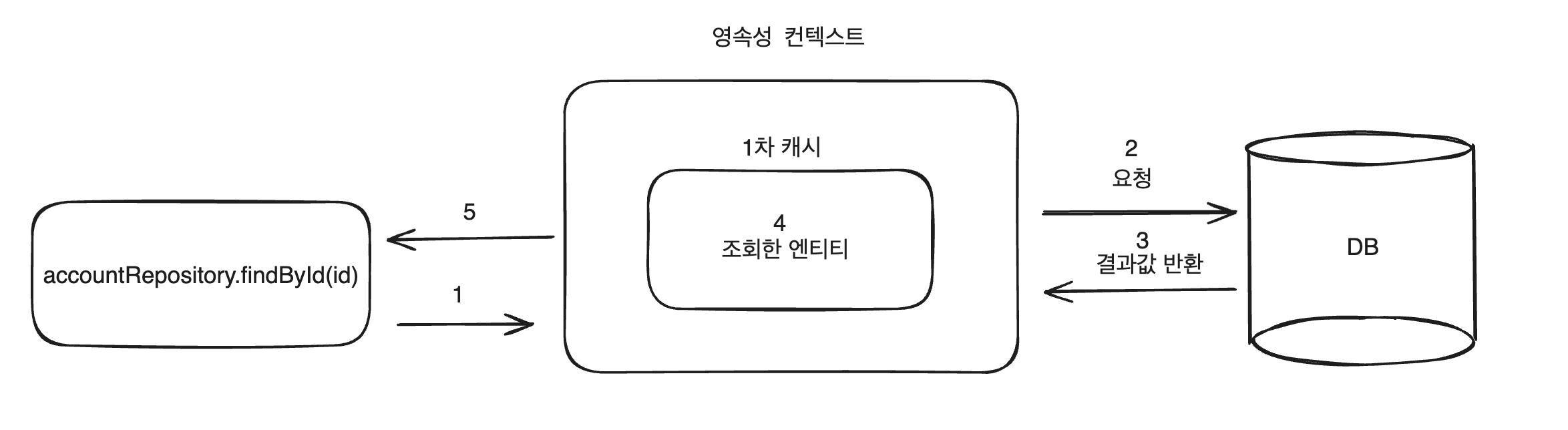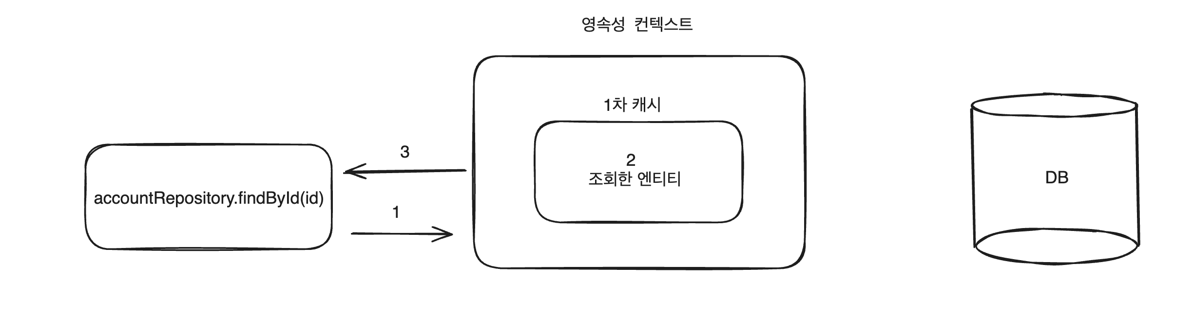 - 조회하려는 엔티티가 1차 캐시에 존재하지 않으면 데이터베이스에 접근을 합니다.
