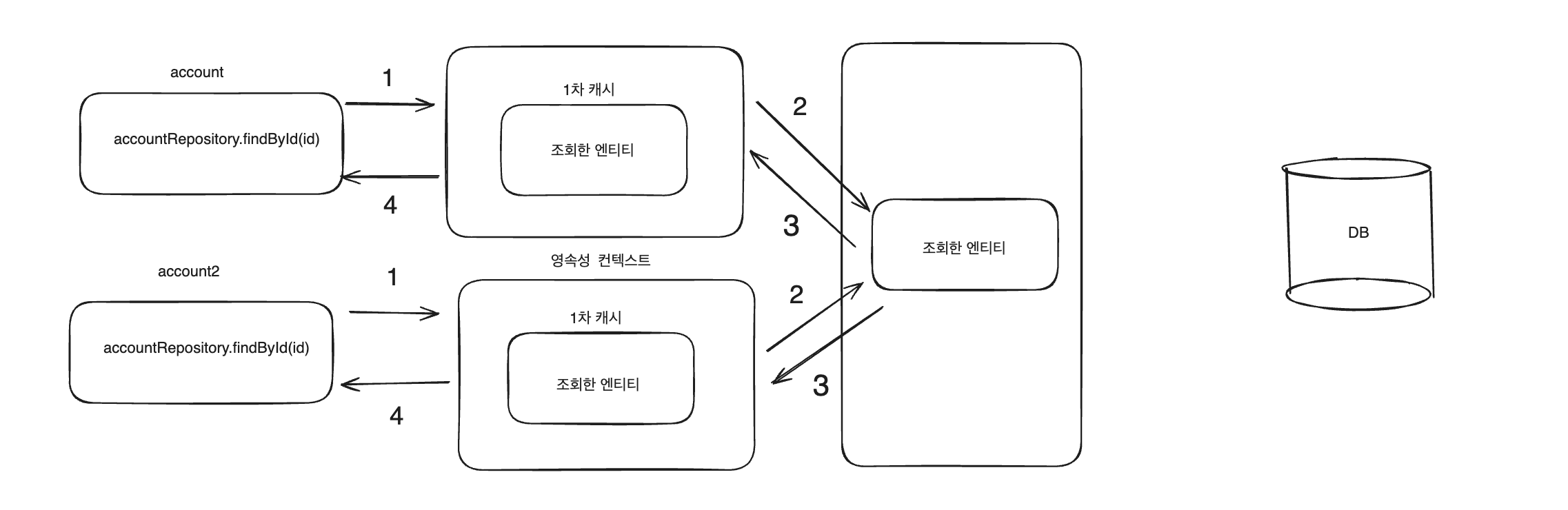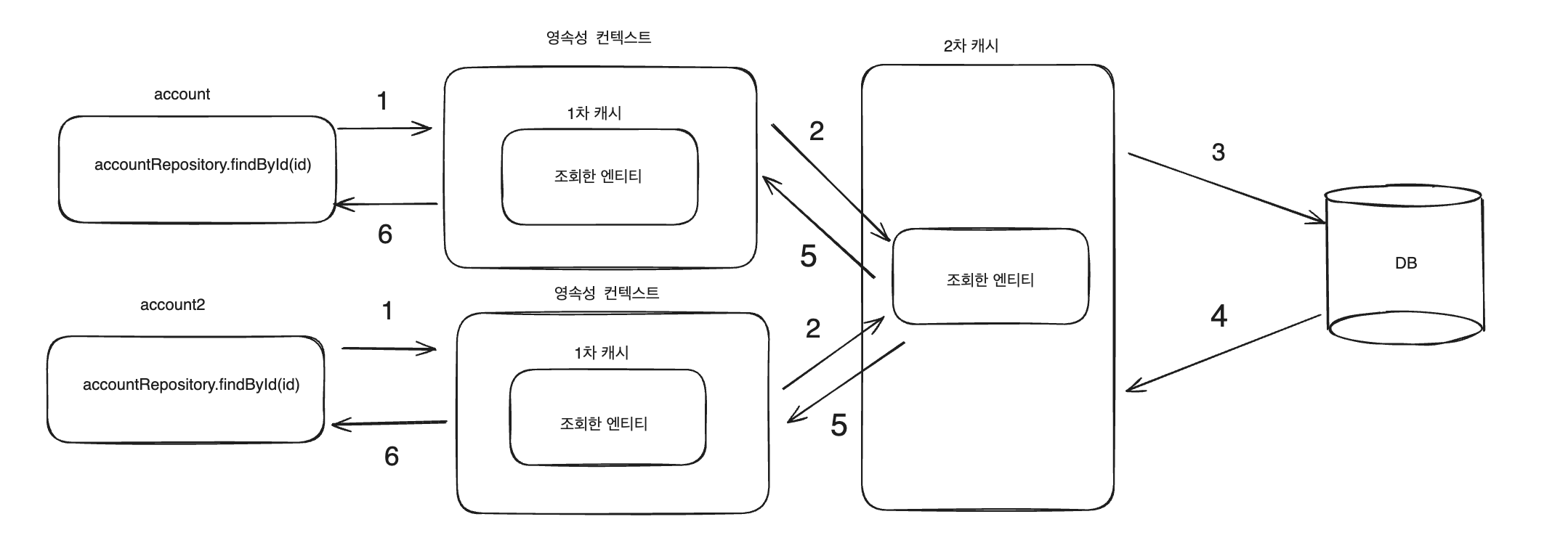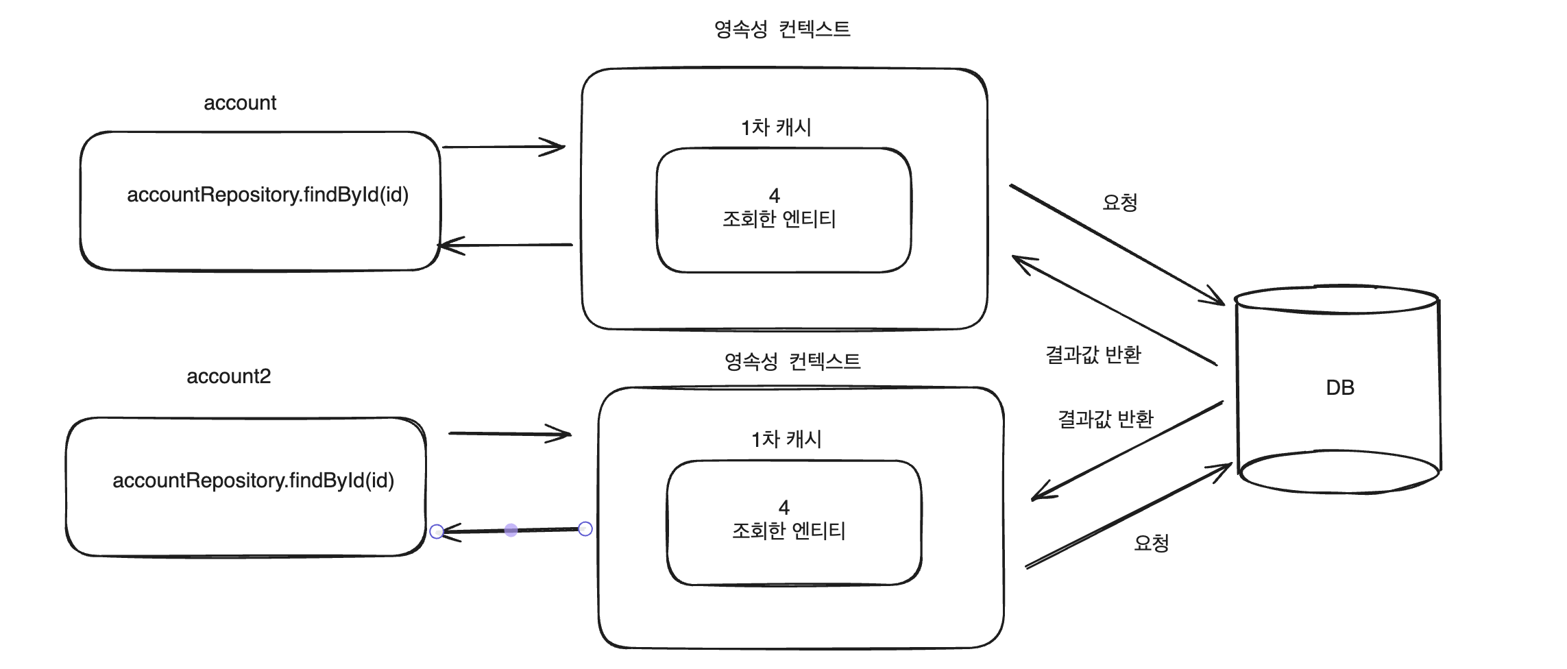 2번의 쿼리가 발생하는 이유는 각각 Service 코드에서 findById를 할 때 account, account2는 각각의 트랜잭션으로 관리가 되어 각자 다른 영속성 컨텍스트에 관리되고 있기 때문에 2번의 쿼리가 발생합니다.