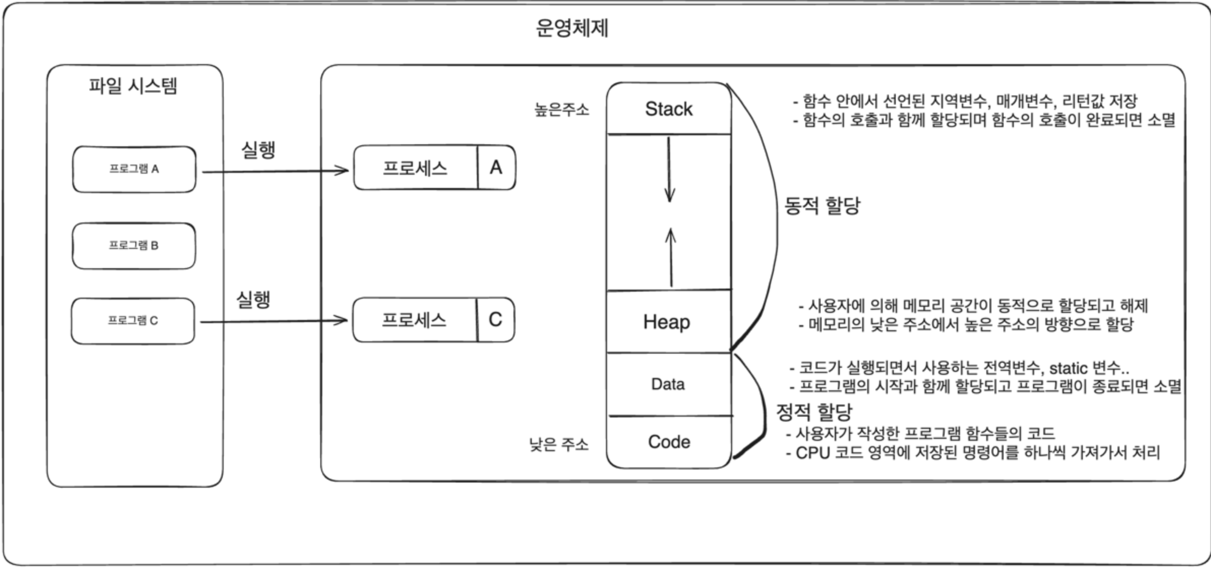 - 운영체제는 프로세마다 각각 독립된 메모리 영역을 Code/Data/Heap/Stack의 형식으로 할당합니다.