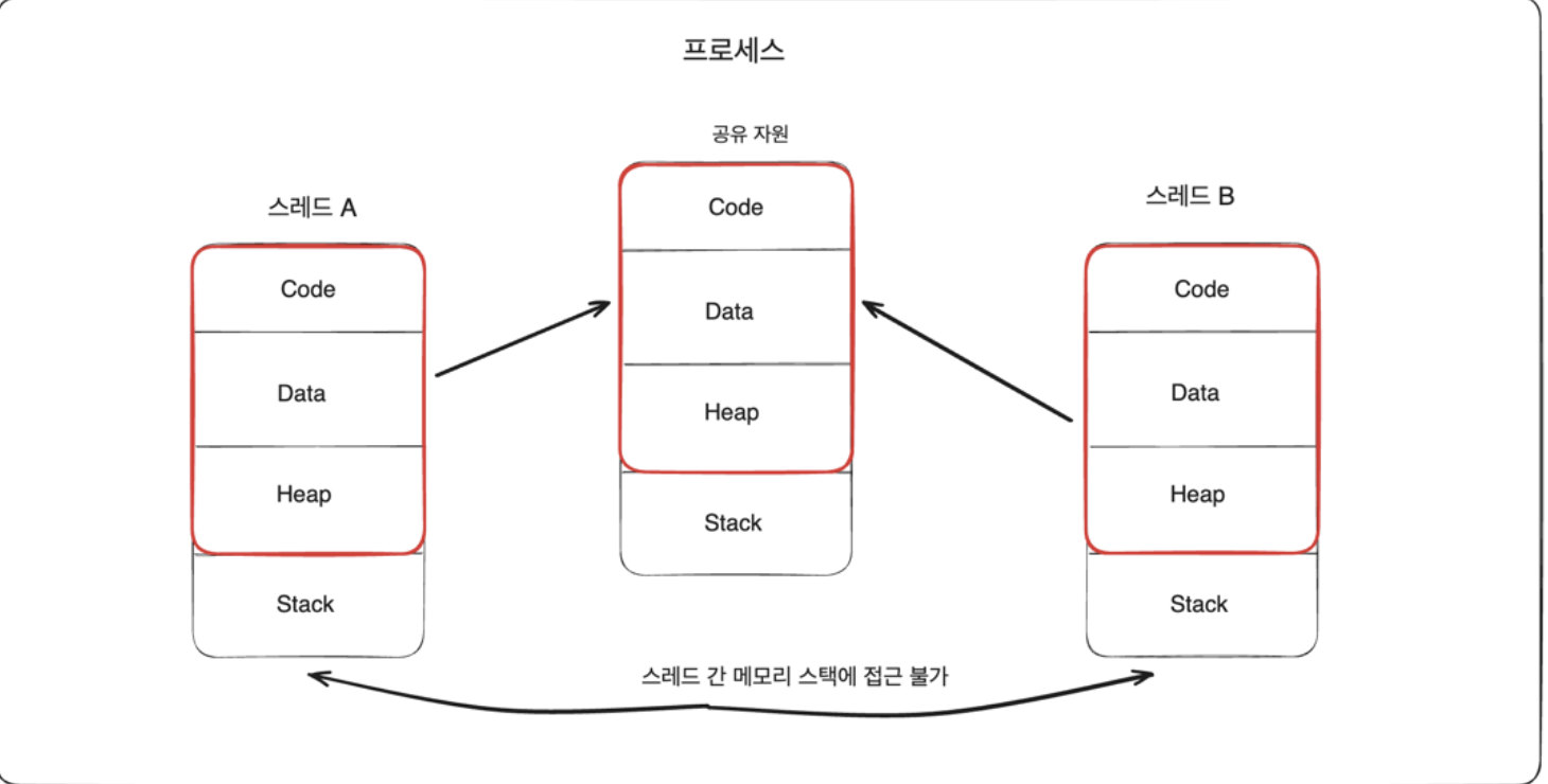 - 프로세스 내에서 각 필요한 Stack만 할당받고 Code/Data/Heap 영역은 공유해서 각 스레드가 공유합니다.