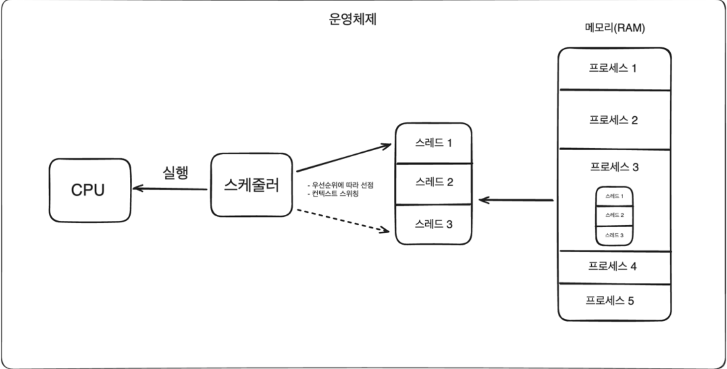 - 스케줄러의 알고리즘에 따라 프로세스에 속한 한 개의 스레드가 선점되어 CPU에 할당됩니다.