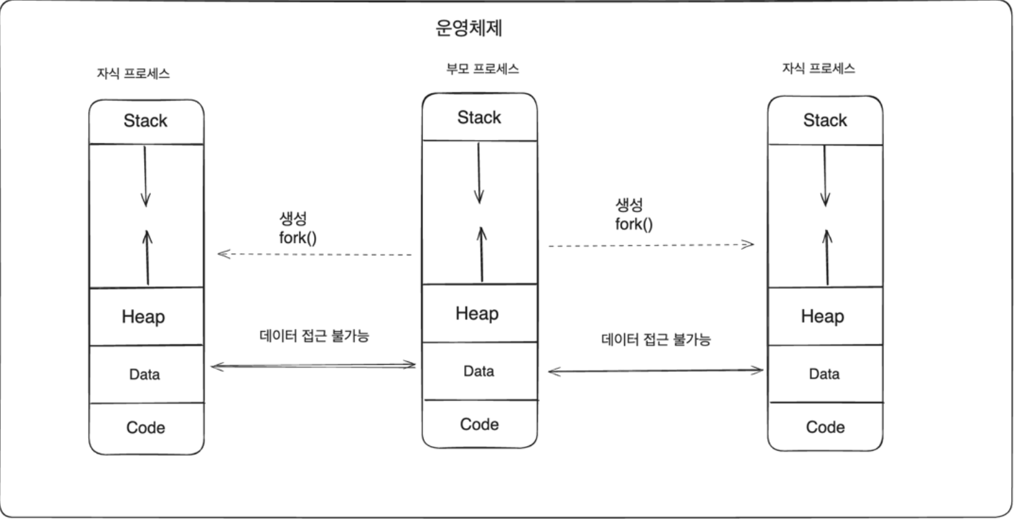 - 기본적으로 다른 프로세스의 변수나 자료에 접근할 수 없고 IPC나 공유메모리 등의 통신기법들을 사용해서 프로세스 간 통신해야 합니다.