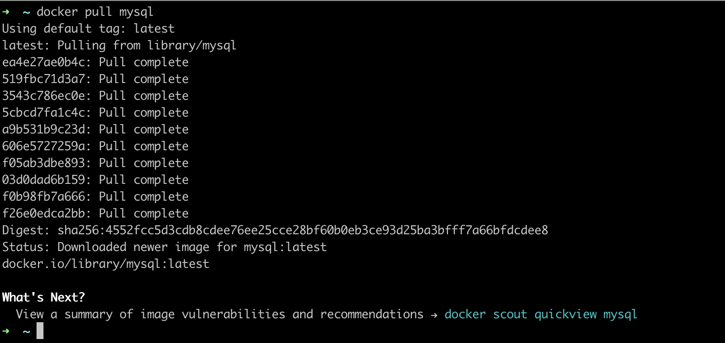 - 위 명령어를 입력을 하면 아래 사진과 같이 mysql 이미지를 다운로드합니다.
