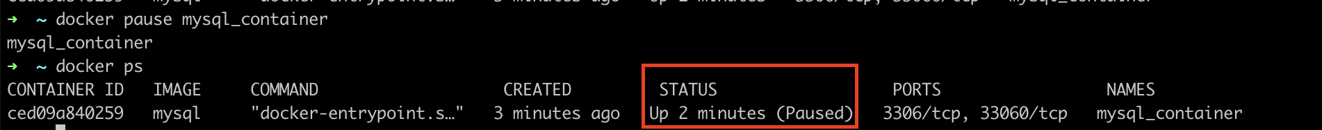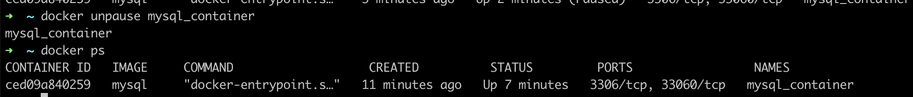 - "unpause" 명령어를 통해 일시정지 되어있던 컨테이너를 다시 실행시킬 수 있습니다. "docker ps" 명령어를 통해 목록을 확인해 보면 Status에서 "Paused" 값이 바뀐 걸 확인할 수 있습니다.