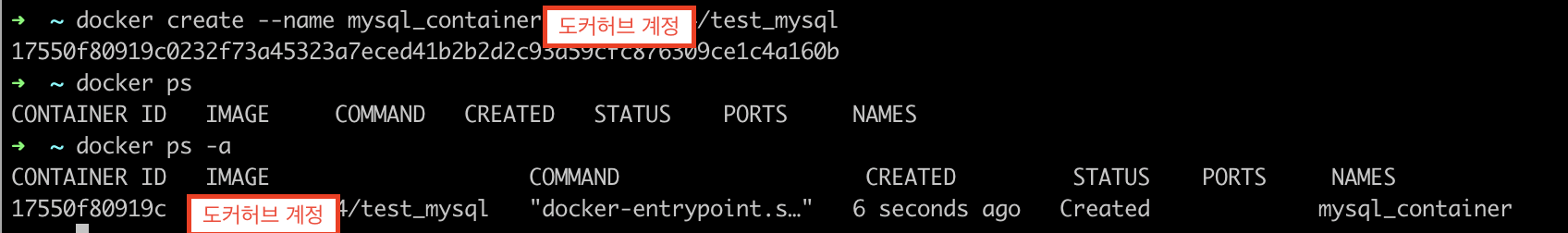 - 위에서 다운로드한 이미지로 "create" 명령어를 통해 컨테이너가 생성된 것을 확인할 수 있습니다.