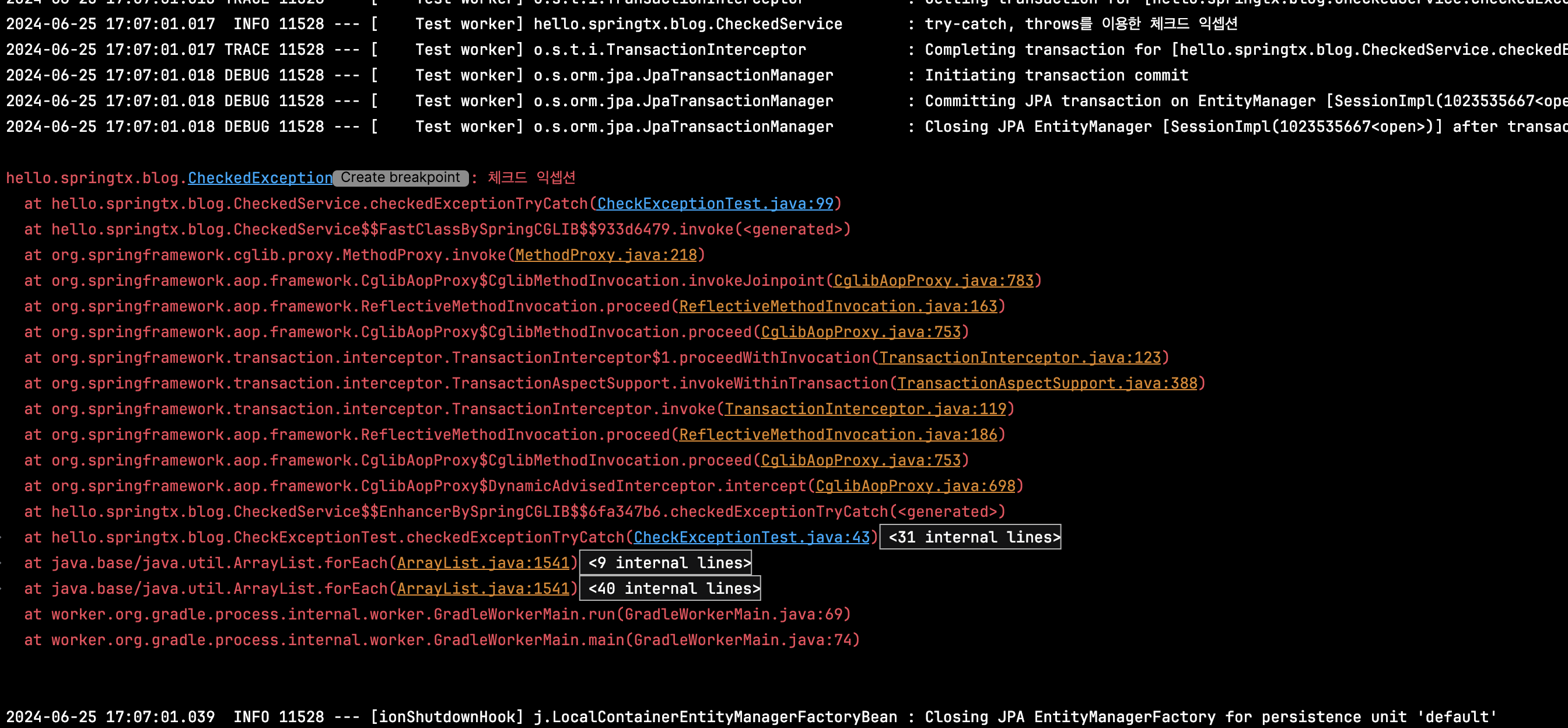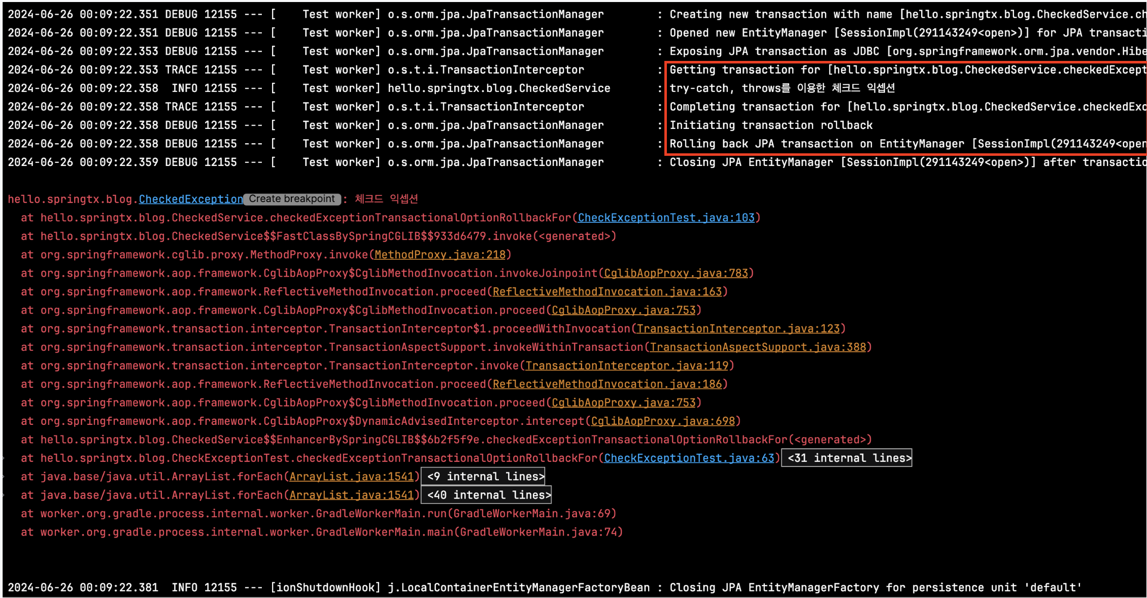 로그를 자세히 보면 에러가 발생하여 에러 메시지가 찍힌 것을 확인할 수 있습니다. 예외가 발생하였는데 로그에 "Committing Jpa Transaction" 내용도 확인할 수 있습니다. 즉 예외가 발생하였음에도 불구하고 롤백이 되지 않고 커밋이 되었다는 것을 의미합니다. 위에서 설명한 거처럼 체크드 익셉션이 발생하면 롤백이 되지 않고 커밋이 된다는 것을 해당 예제에서 확인할 수 있습니다.