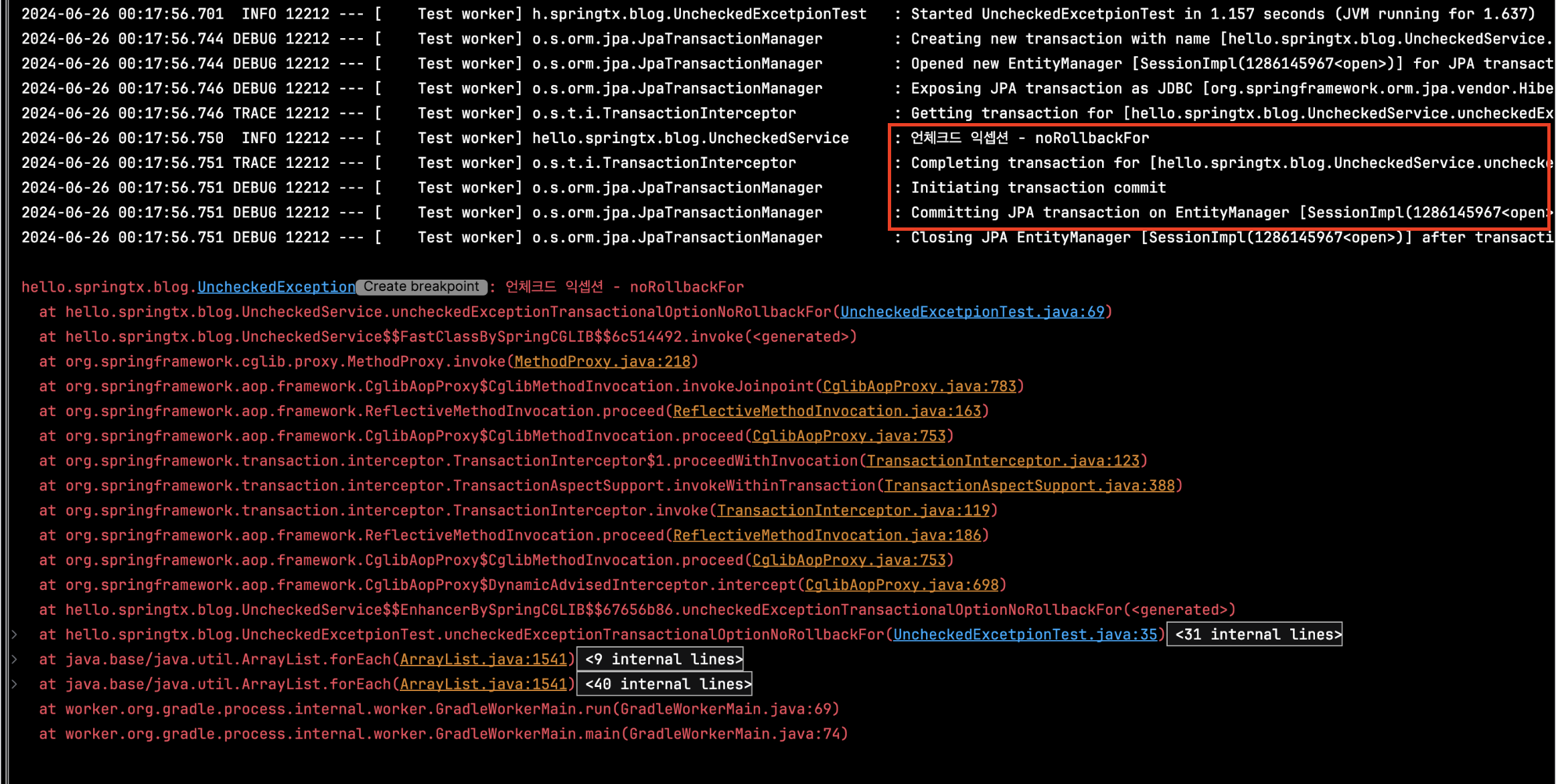 로그를 자세히 보면 체크드 익셉션과 달리 언체크드 익셉션은 예외가 발생하면 커밋이 되지 않고 롤백이 진행됩니다.