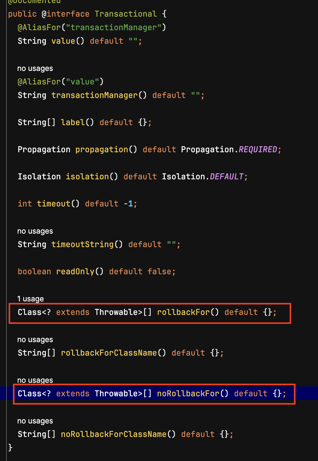 스프링에서 제공하는 @Transactional 내부를 확인해 보면 rollbackFor, noRollbackFor이 있습니다. 먼저 rollbackFor에 대해서 알아보겠습니다.