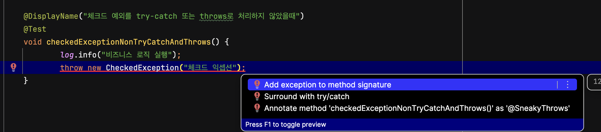 @DisplayName("체크드 예외를 try-catch 또는 throws로 처리하지 않았을때")