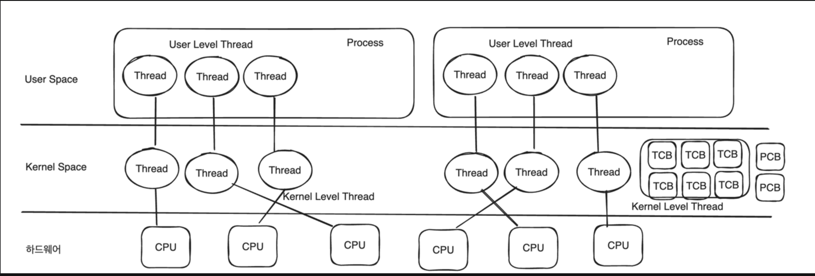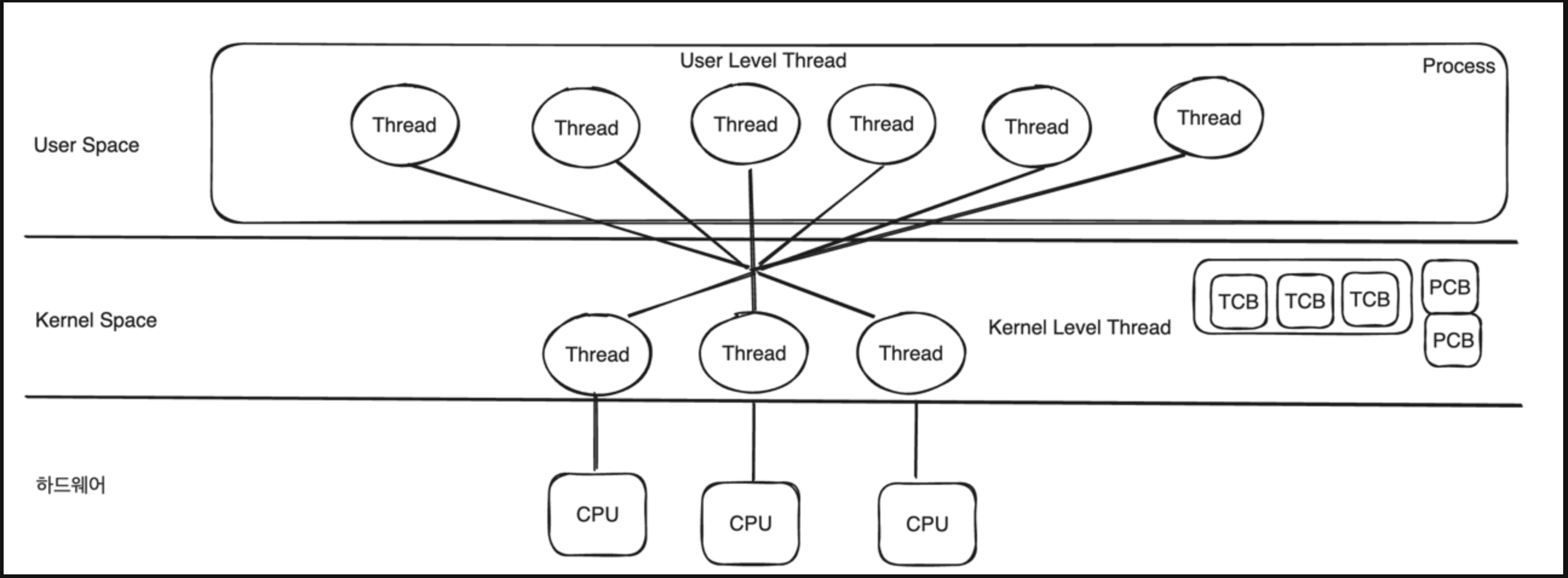 - 각 커널 수준 스레드가 한 개 이상의 사용자 수준 스레드와 매핑됩니다.