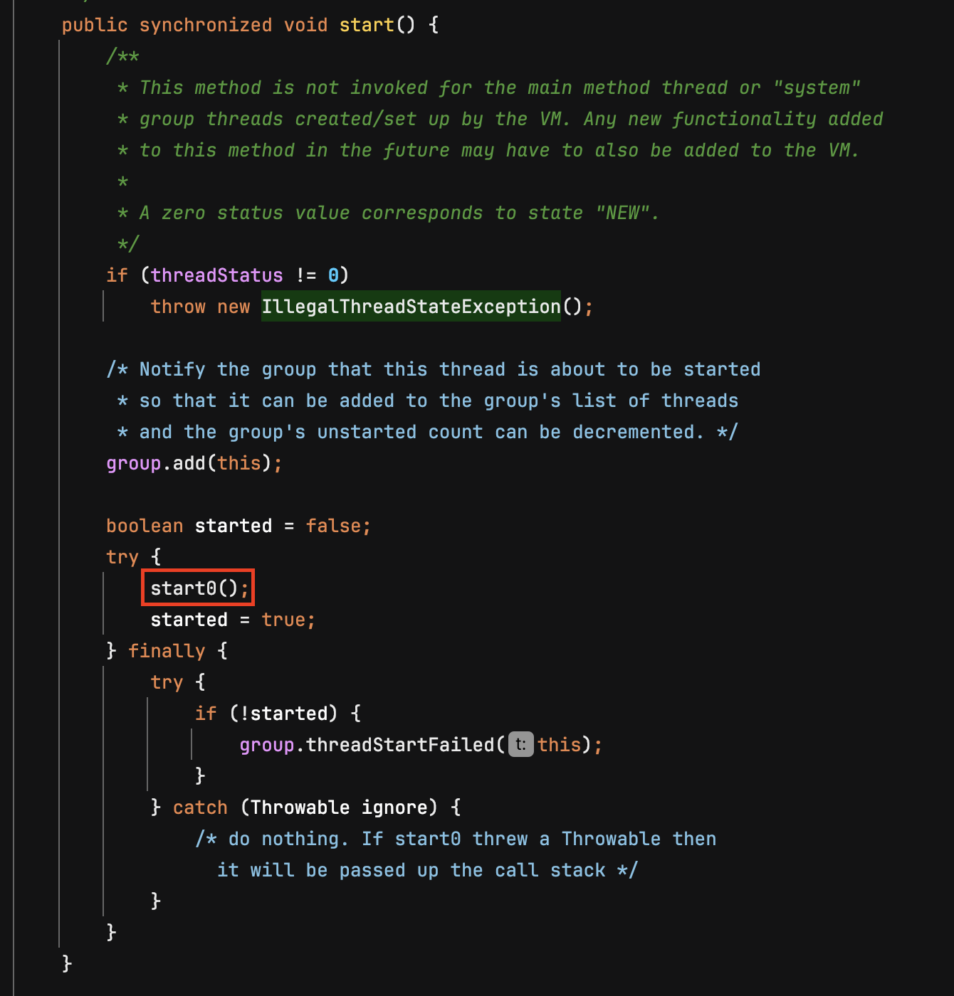 해당 메서드를 호출을 하면 사용자 수준 스레드에서 커널 수준 스레드로 전환이 됩니다.