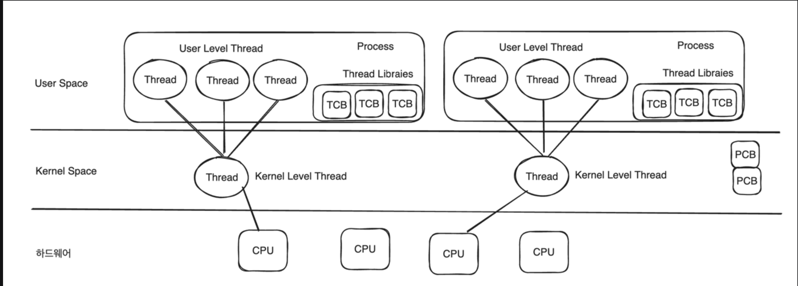 여러 개의 사용자 수준 스레드가 하나의 커널 수준 스레드와 매핑되는 모델입니다.(자바 초기버전의 Green Thread가 이 모델에 해당)