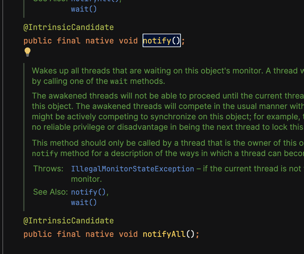이때 위에서 설명한 Timed Waiting과 달리 기본 Waiting 상태는 시간을 지정하지 않기 때문에 정지 상태를 해제하고 싶다면 notify, notifyAll 메서드를 사용하여 실행 가능한 상태로 변경할 수 있습니다.