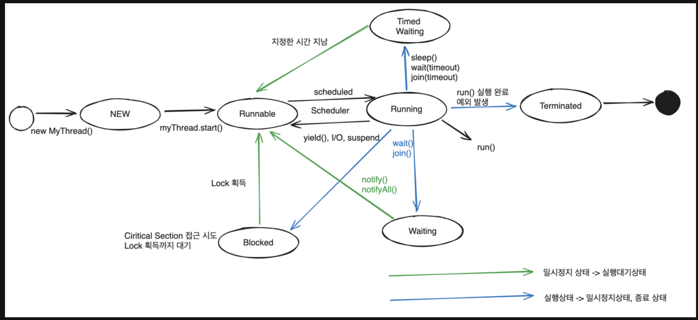 예외가 발생하거나 커널 수준 스레드에서 실행한 사용자 수준 스레드의 run 메서드가 정상적으로 실행이 되고 스레드가 끝나면 스레드는 종료상태가 됩니다.