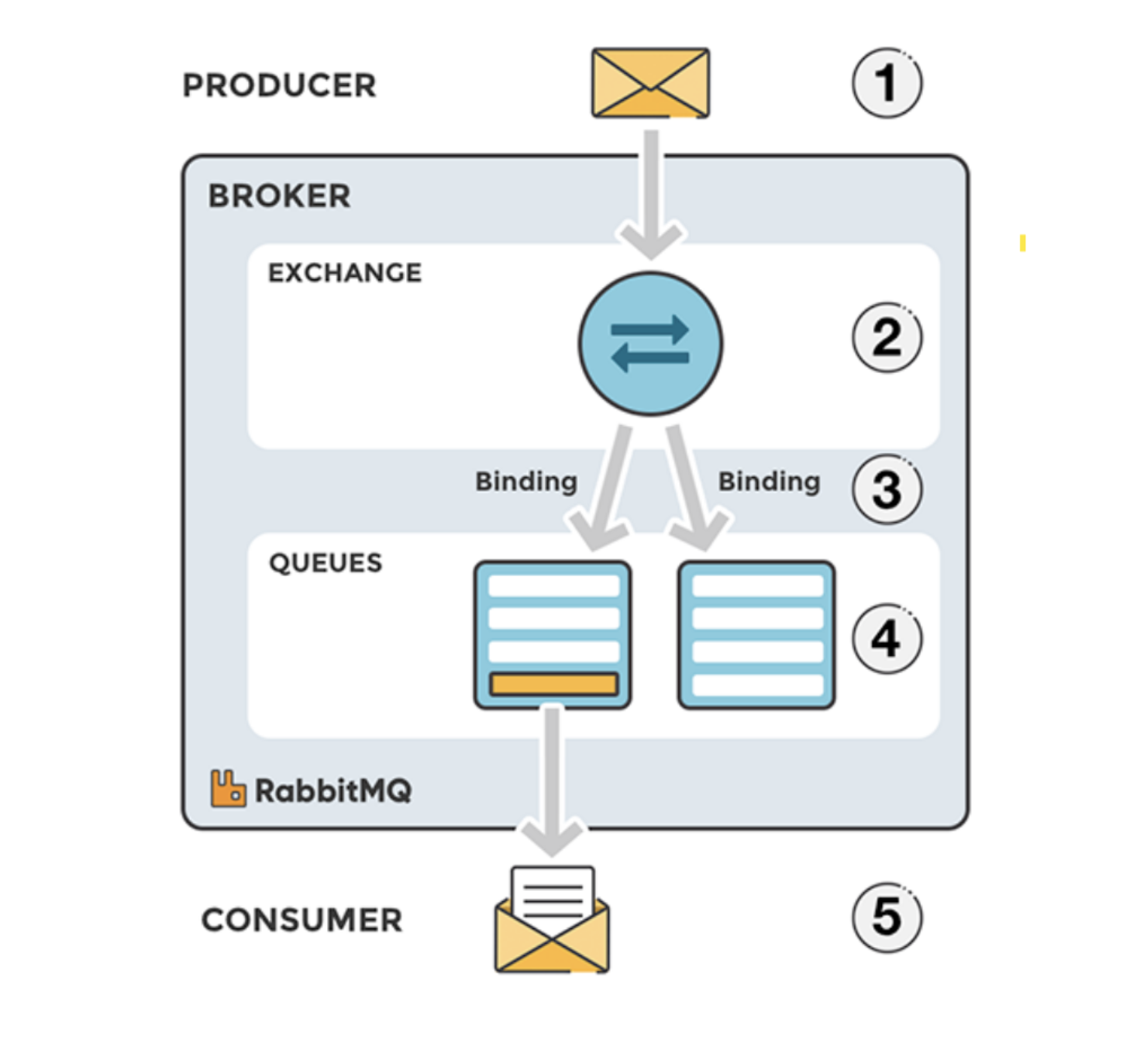 - Exchange : 생산자가 발행한 메시지를 보관하고 있다가 알맞은 큐에 전달하는 매개체