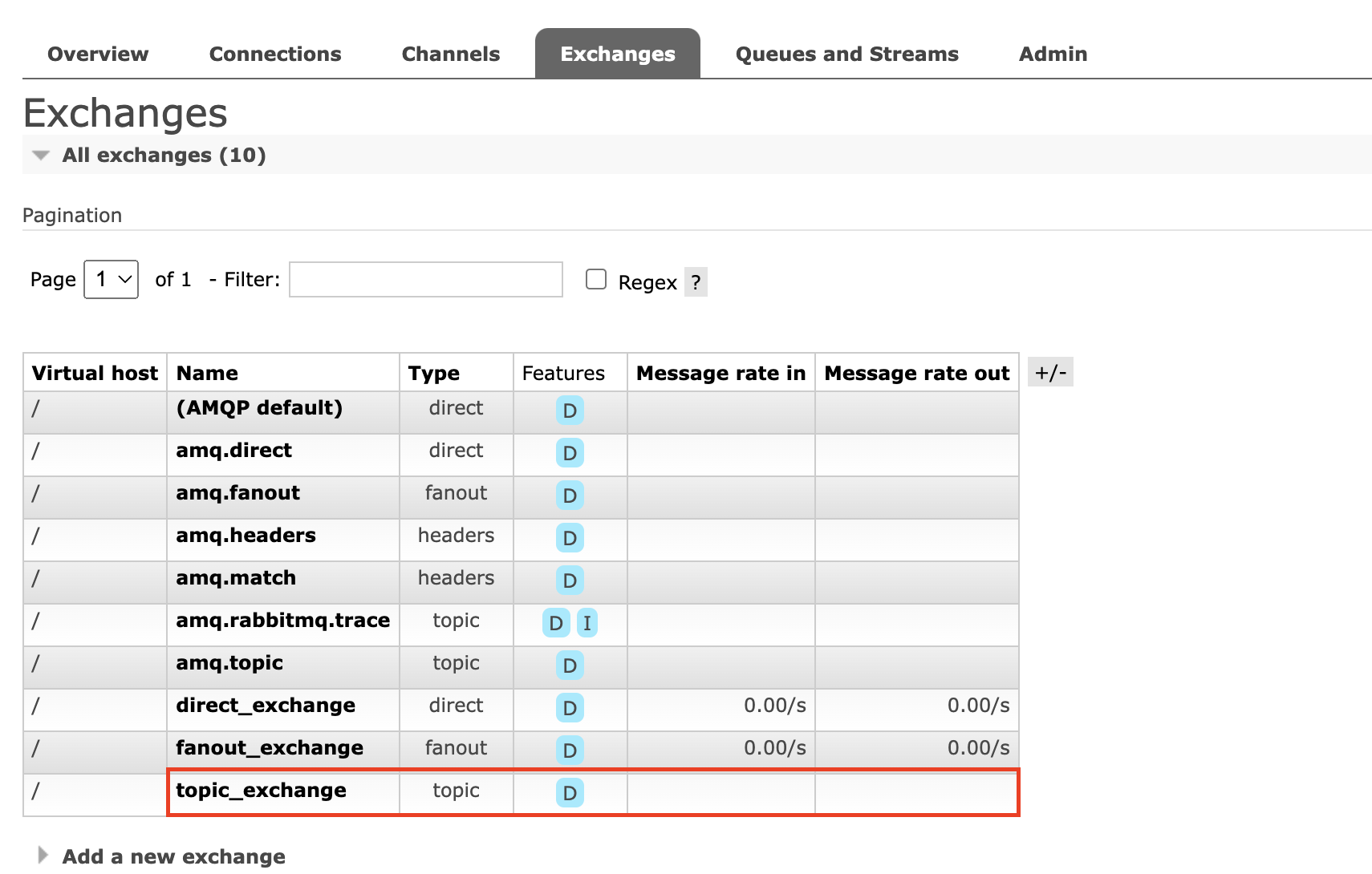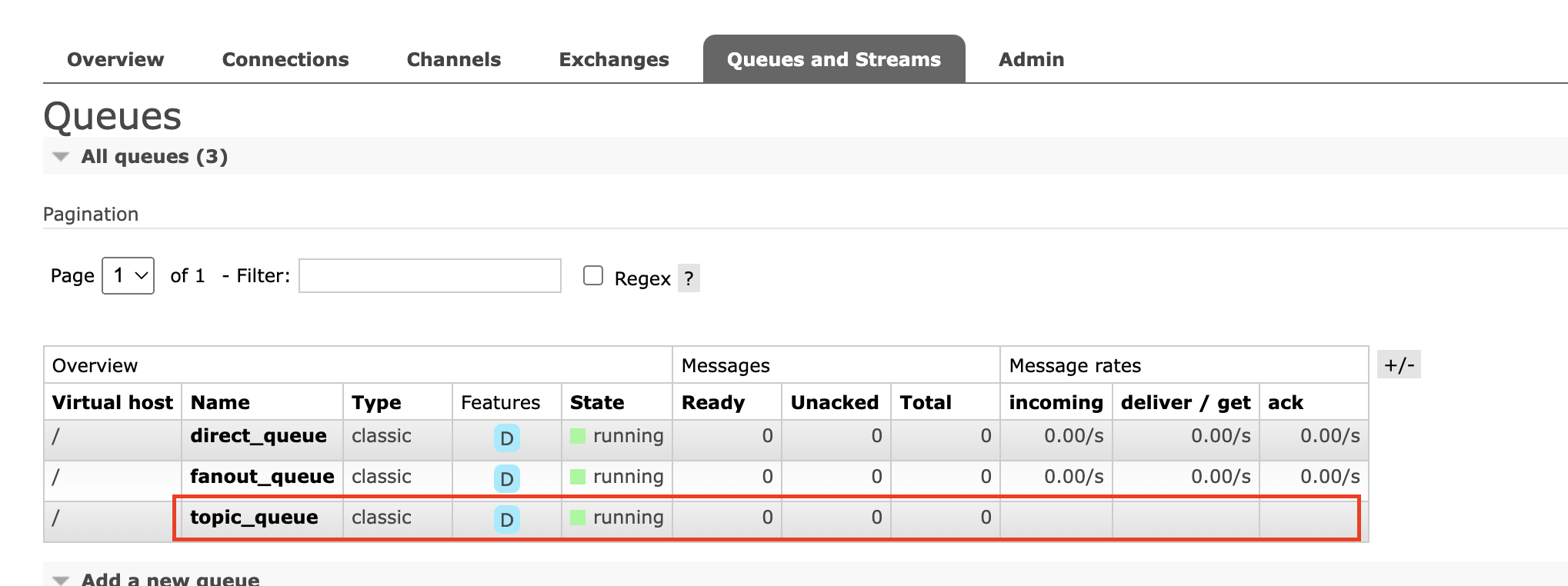 Direct, Fanout과 동일하게 Topic Exchange와 Queue가 Management에 노출되는 것을 확인할 수 있습니다.