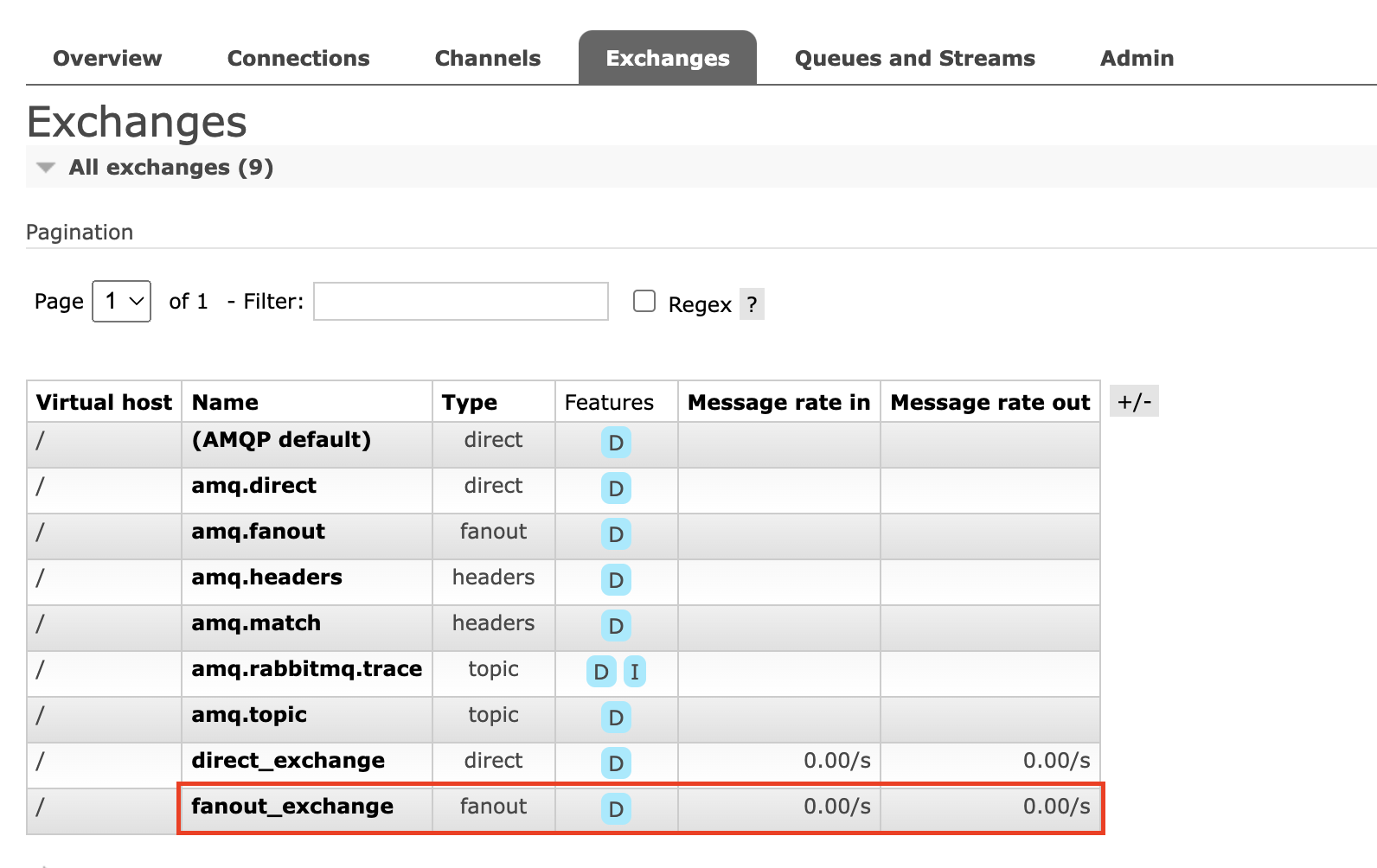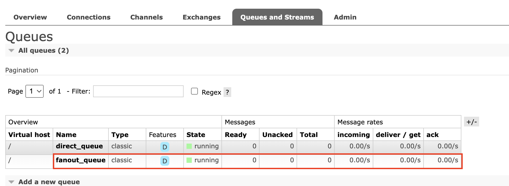 Direct와 동일하게 Fanout Exchange와 Queue가 Management에 노출되는 것을 확인할 수 있습니다.