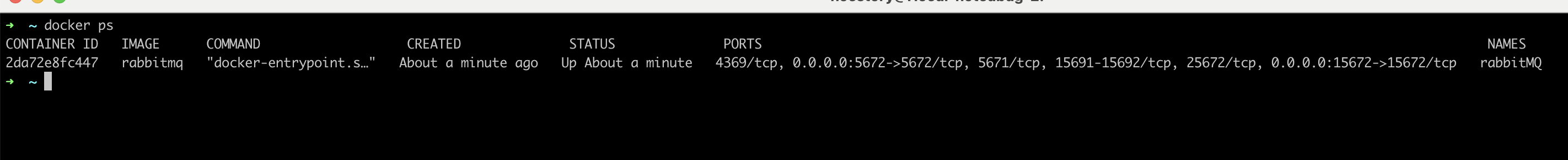 위와 같이 명령어를 입력하고 현재 실행 중인 컨테이너를 확인해 보면 RabbitMQ가 있는 것을 확인할 수 있습니다.