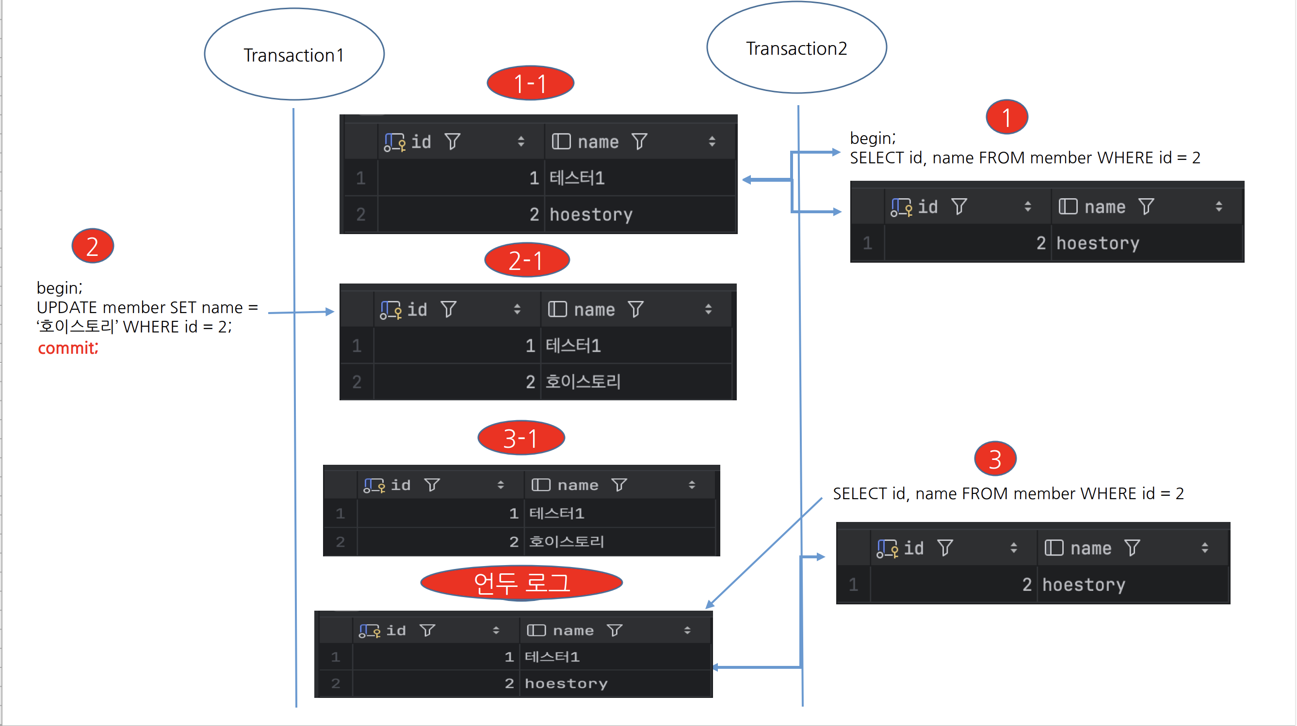 트랜잭션 1의 "2번 작업"에서 Update 쿼리를 Commit 한 뒤 트랜잭션 2의 3번 작업에서는 언두 로그에 접근하는 게 아닌 Update 쿼리가 수행된 "3-1" 데이터에 접근하여 결과를 조회합니다.