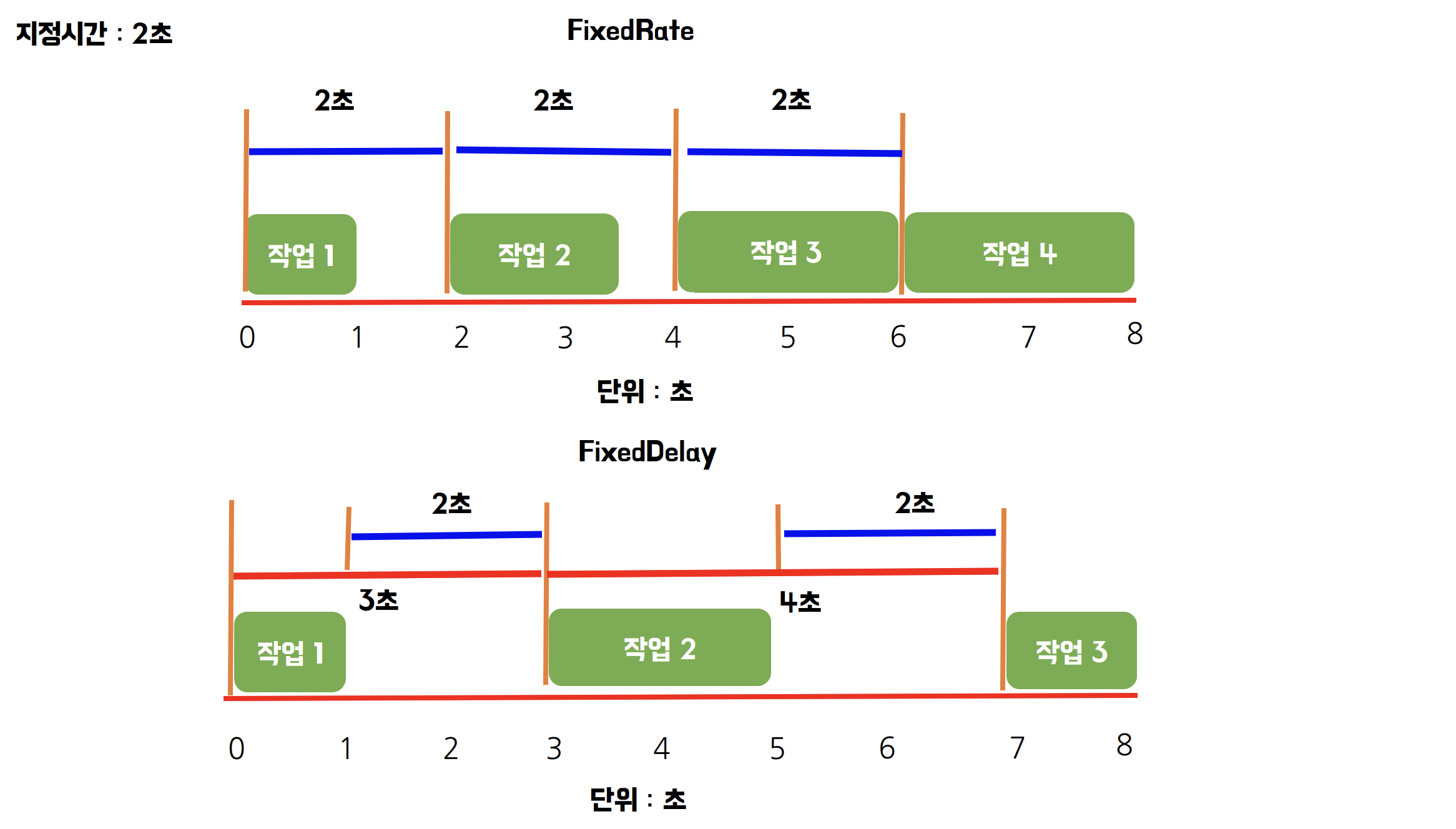 - fixedRate : 작업 시작 시간 기준으로 일정 간격마다 작업 설정