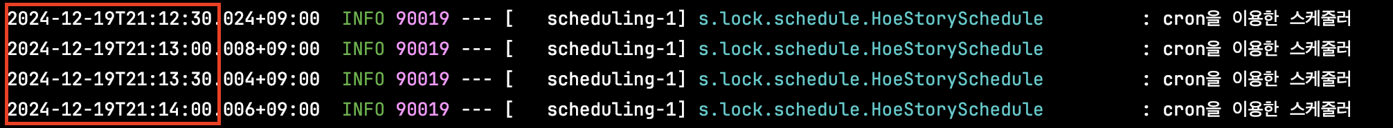 위 코드는 zone 설정을 서울 기준으로 설정하였고 cron 설정을 통해 매일 30초씩 실행하는 스케줄러입니다.